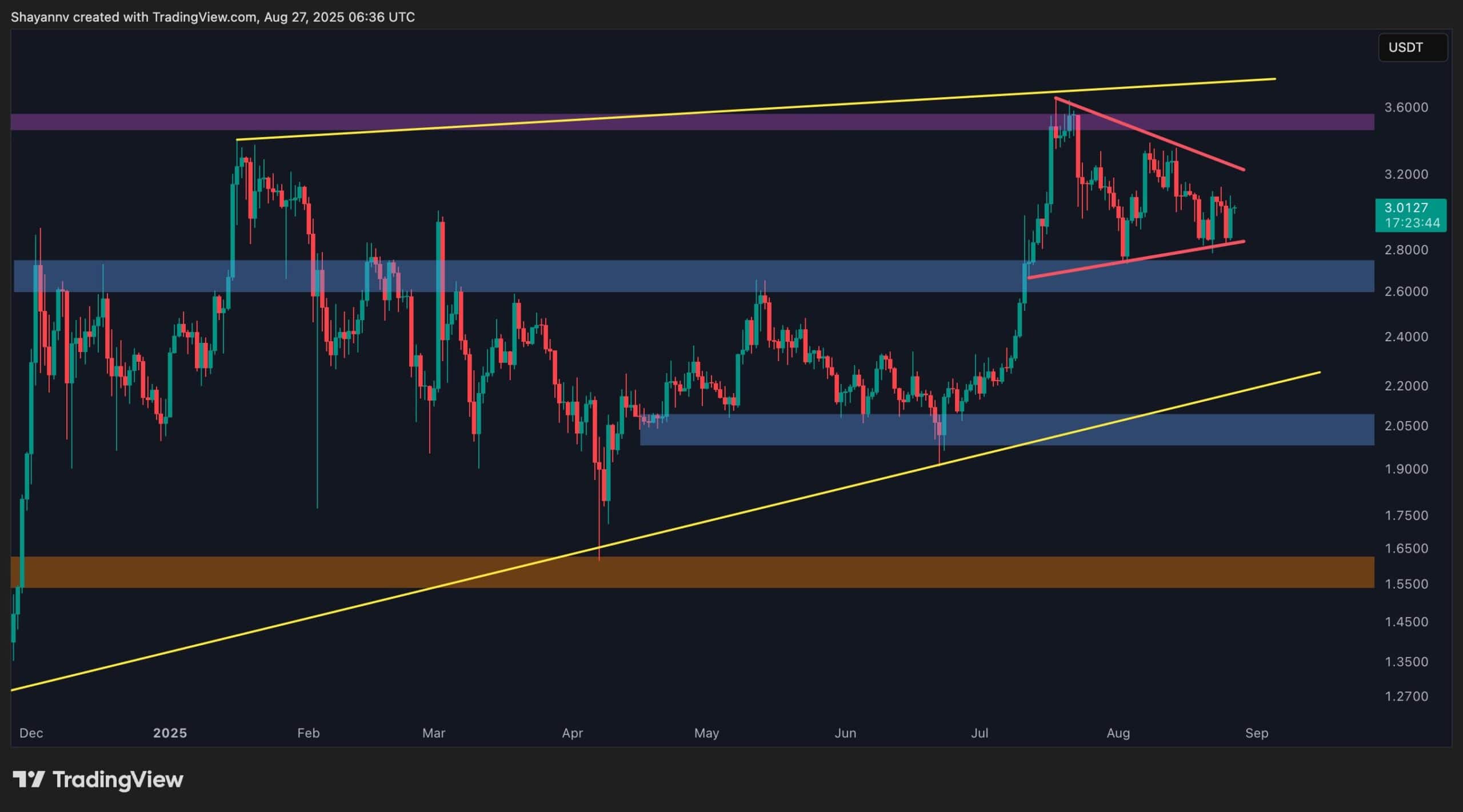 Conversely, a failure to defend $2.8 support could trigger a deeper correction toward the $2 zone, where the next significant demand cluster lies.