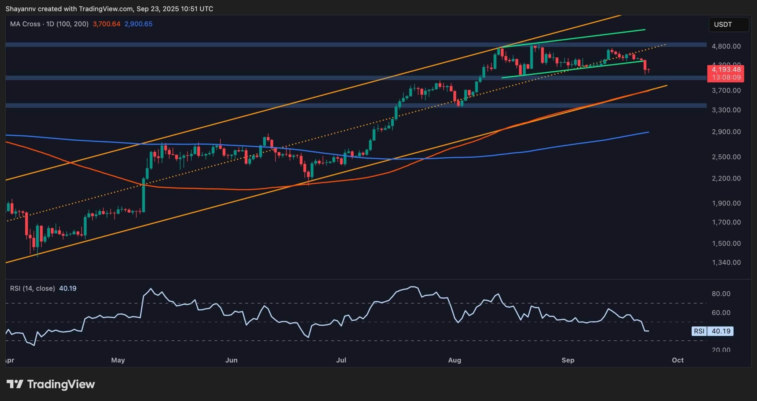 The first major support is found near $4,000, followed by the $3,800 area, which lines up with the 100-day moving average and the lower boundary of the larger channel. If buyers defend this level, ETH could form a higher low structure, keeping the broader uptrend intact.