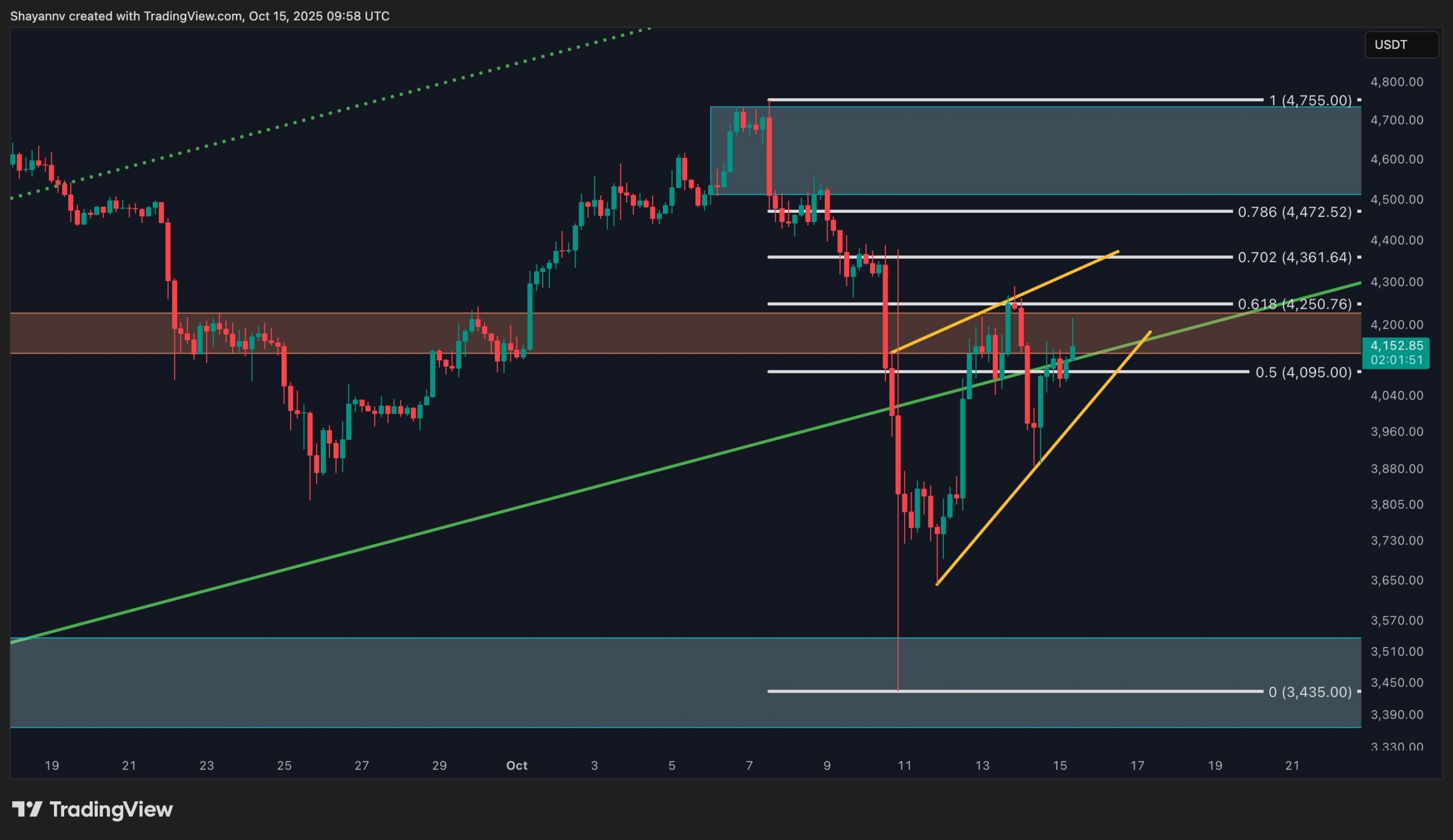 The 4-hour structure reveals Ethereum forming a rising wedge pattern following its sharp V-shaped rebound from the $3.4K low. The asset is now trading near the 0.618 Fibonacci retracement zone around $4.25K, which overlaps with the former breakdown area ($4.2K–$4.3K), making this a key decision point for short-term direction.
