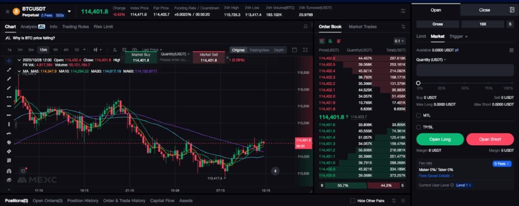 MEXC also supports a full derivatives suit with its futures market. Here, users can trade perpetual contracts, which means they trade synthetic assets rather than owning the underlying ones. This, however, allows them to use leverage and advanced order types such as trigger orders, trailing stops, and more.
