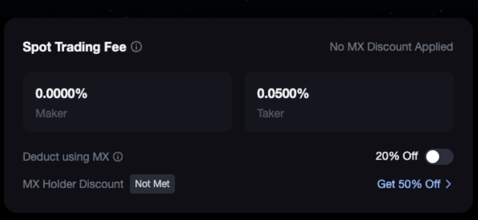 *You can get up to 20% off your taker fees if you choose to pay them with MX tokens, while also enjoying additional tier-based discounts if you hold MX tokens.