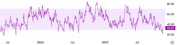 The metric measures the speed and magnitude of the latest price movements to give traders an idea of whether the asset is about to have a reversal moment. Ratios below 30 signal that SUI is oversold and could be due for a rally, whereas anything above 70 is interpreted as bearish territory.