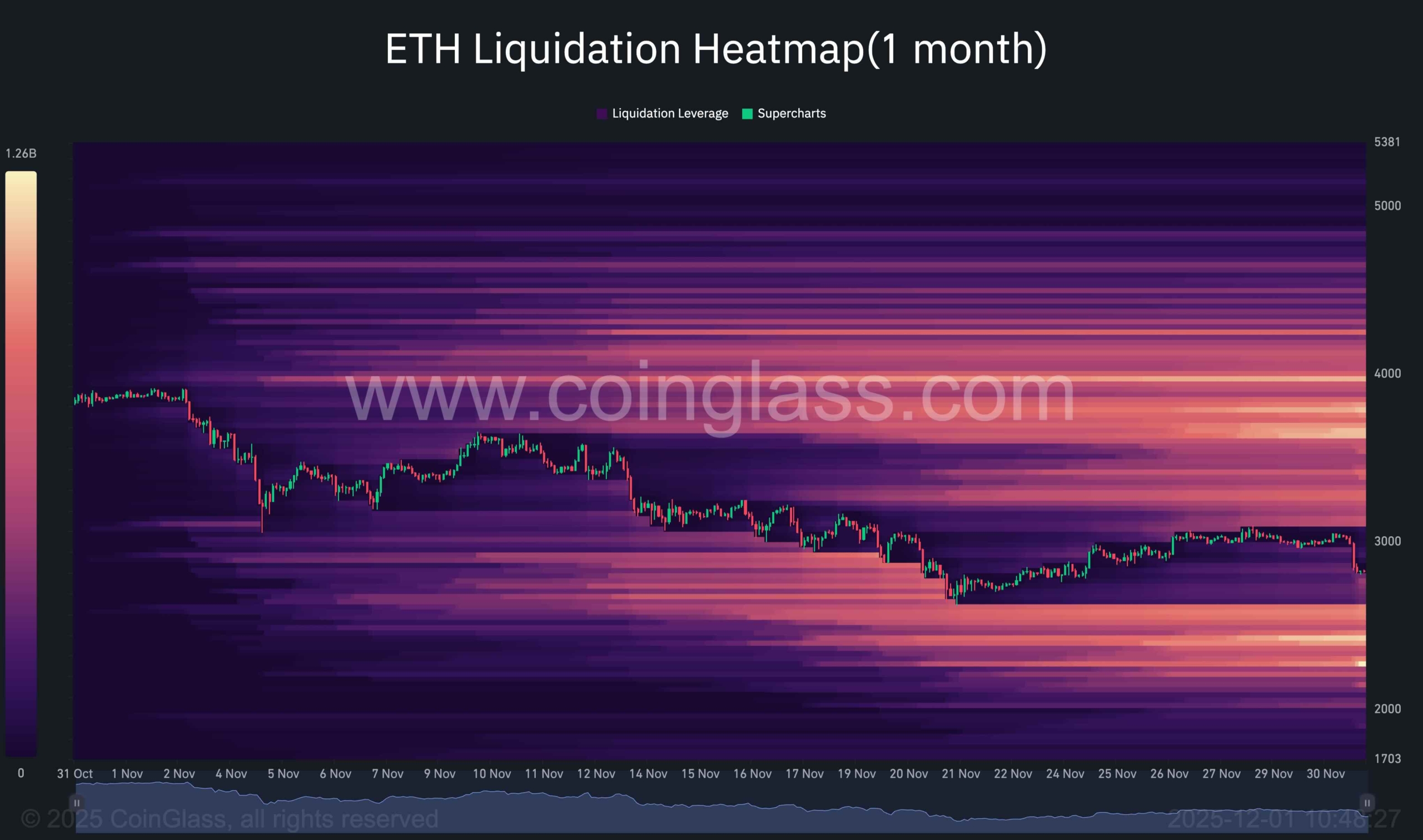 The one-month liquidation heatmap shows significant leverage concentrations between $3,200 and $3,600, reflecting the clustering of long positions that continue to get trapped during each corrective wave. As prices approach these levels, repeated liquidations generate heavy sell pressure, preventing sustained upside continuation.