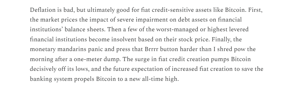 This is a dramatic chain of events: AI job losses lead to credit losses, which cause bank stress, which forces the central bank to expand money supply, which lifts Bitcoin.