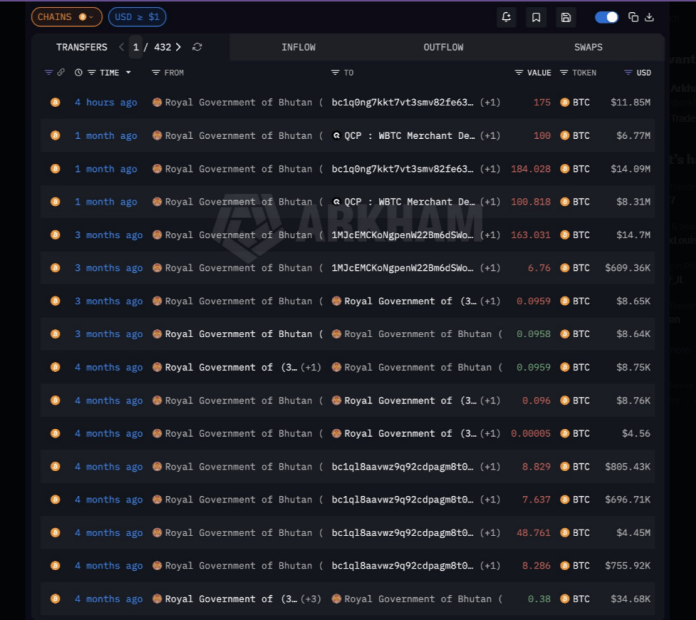 On Monday, blockchain analytics firm Arkham flagged a transfer of 175 Bitcoin, worth roughly $11.85 million, out of Bhutan’s main government wallet.